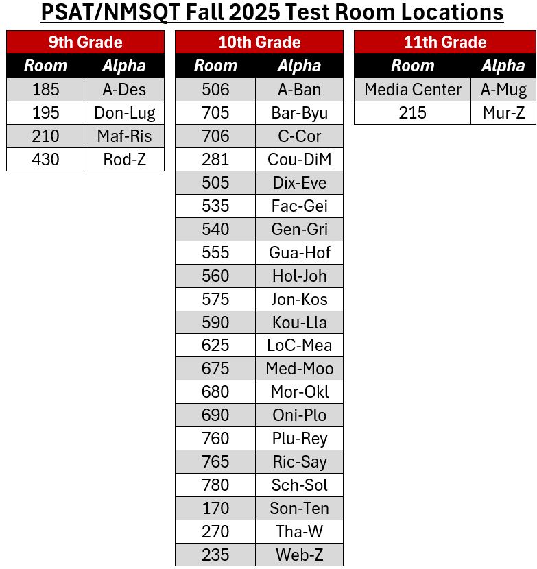 ⚠️ Students who are scheduled to take the PSAT with College Board-approved accommodations will receive a testing pass prior to test day. This pass will include their assigned testing room and other important test day details. Passes will be distributed by each student’s English teacher in the days leading up to the exam. Please remind your student to keep their pass in a safe place and bring it with them on test day.
