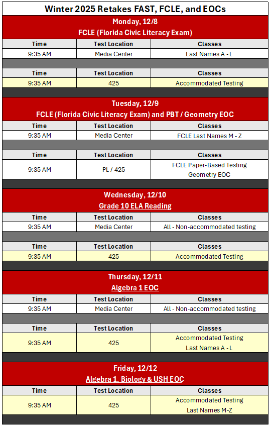 📢 Attention Testing Students: If you would like to be included in the Retakes for B.E.S.T. Algebra 1, Geometry, Biology 1, Civics, and U.S. History EOCs, please see your School Counselor to get signed up for testing.